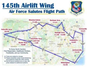 The 145th Airlift Wing, North Carolina Air National Guard will be conducting a one aircraft C-17 flyover of various North Carolina cities, hospitals, and food banks on Thursday, May 7, as part of Operation: American Resolve. The flyover is to demonstrate the Department of the Air Force’s continued readiness during the national COVID-19 response, while saluting the American heroes at the forefront in our fight against COVID-19. These flyovers will incur no additional cost to taxpayers and are being conducted as part of regularly scheduled training.