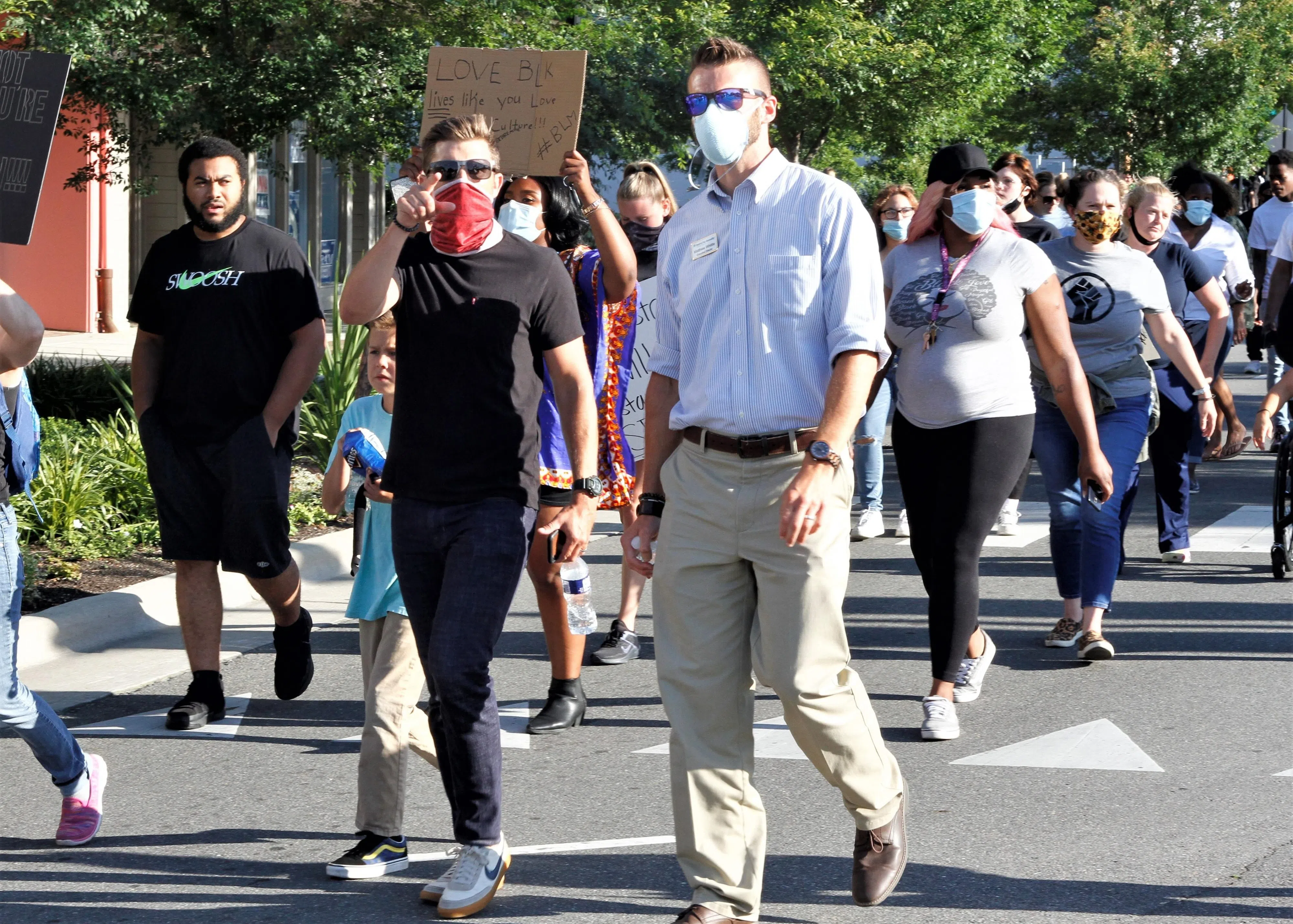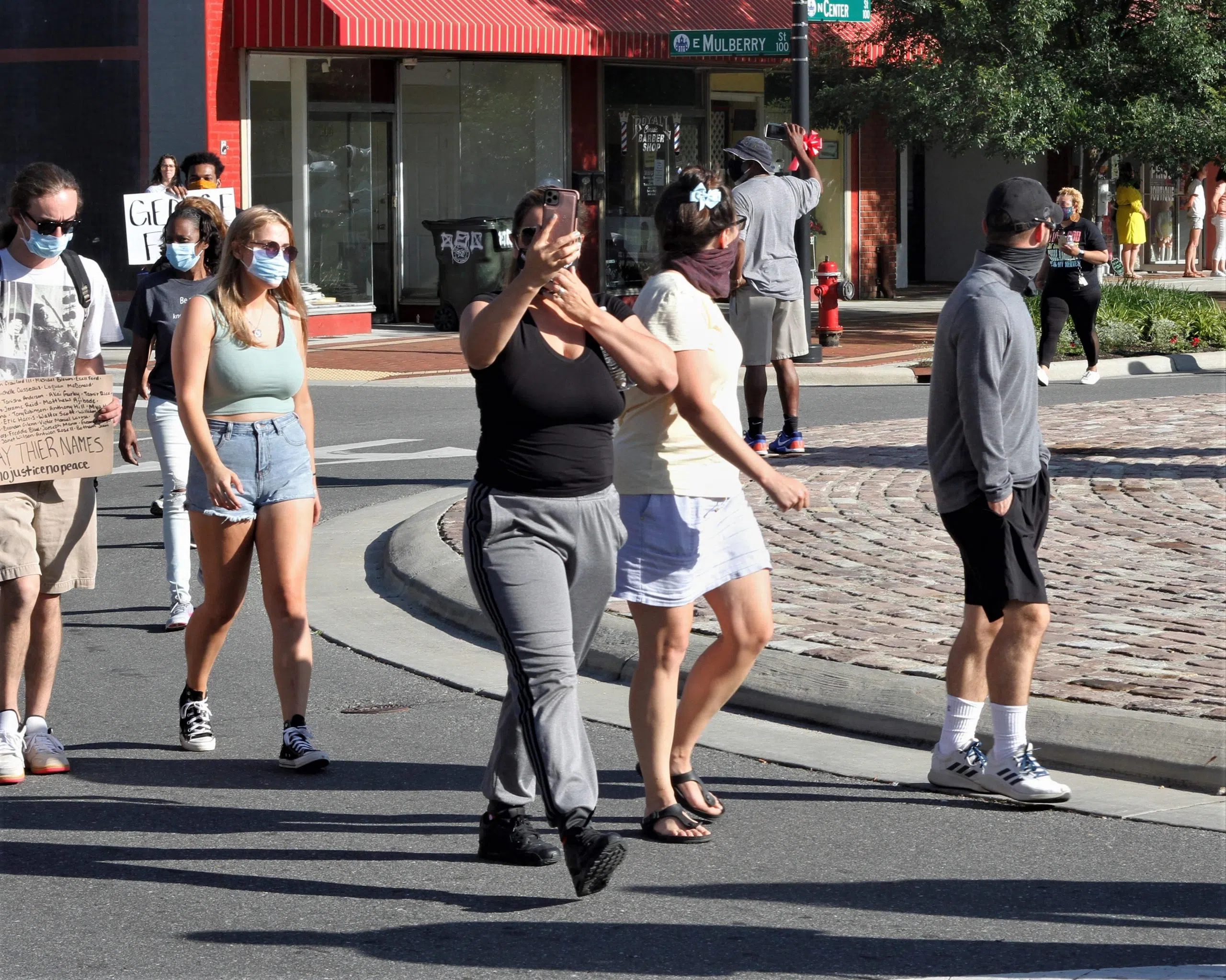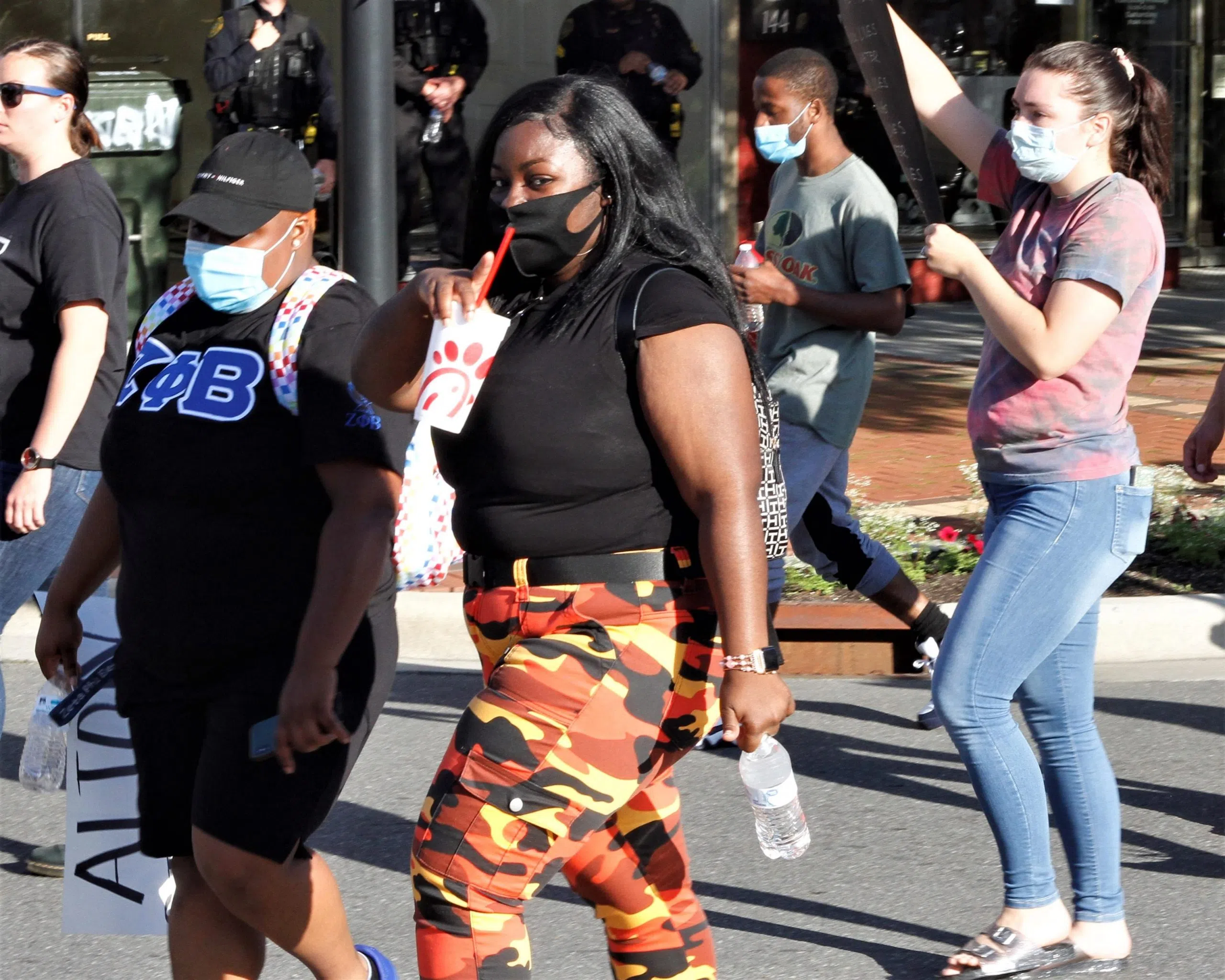 Goldsboro Daily News photographer Bobby Williams captured these images during Monday’s peaceful protest in Downtown Goldsboro. Demonstrators started gathering at Goldsboro City Hall around 5 PM. Once the crowd arrived, they marched through the downtown streets to the Wayne County Courthouse and back. Pizza and water were donated for the demonstration, and Goldsboro Police Department officers assigned to keep the event safe were often spotted interacting and talking with the attendees. The demonstration was the second in the downtown area since Sunday.