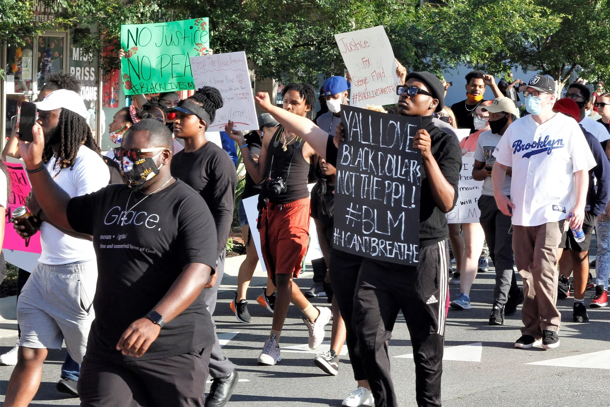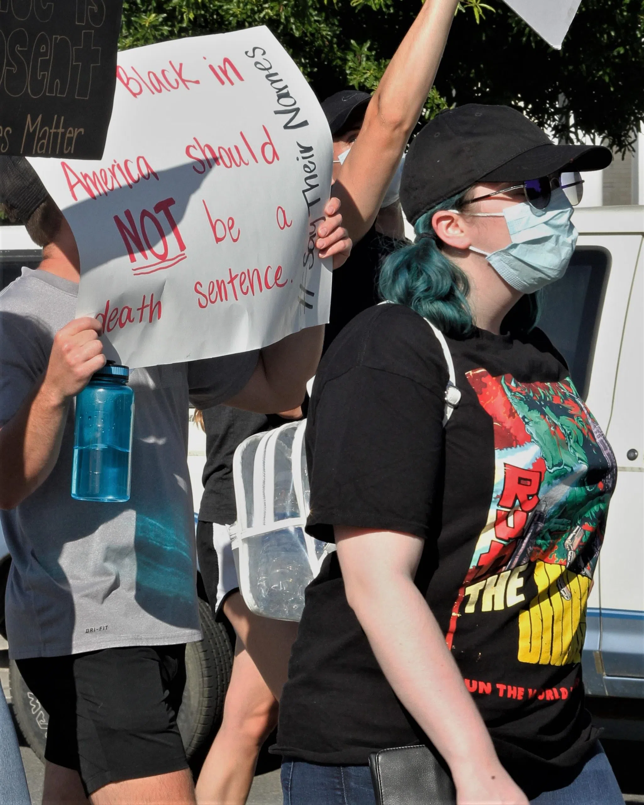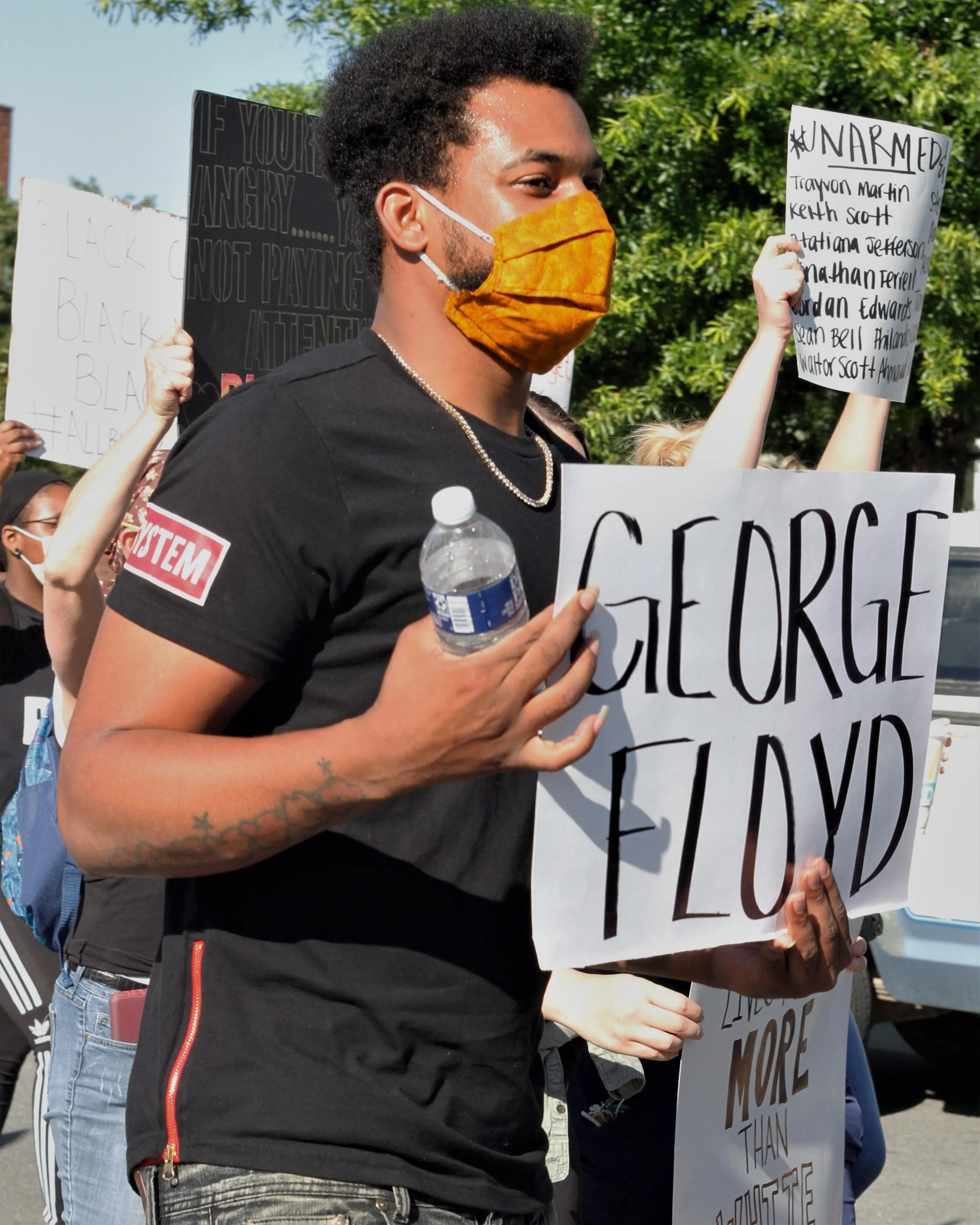 Goldsboro Daily News photographer Bobby Williams captured these images during Monday’s peaceful protest in Downtown Goldsboro. Demonstrators started gathering at Goldsboro City Hall around 5 PM. Once the crowd arrived, they marched through the downtown streets to the Wayne County Courthouse and back. Pizza and water were donated for the demonstration, and Goldsboro Police Department officers assigned to keep the event safe were often spotted interacting and talking with the attendees. The demonstration was the second in the downtown area since Sunday.