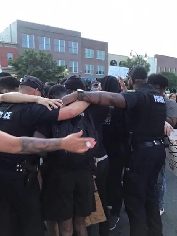 Monday evening’s local protest remained exceptionally peaceful with the demonstrators even pausing to hug the Goldsboro Police Department officers that were tasked with ensuring the event stayed safe, as captured by community activist Rodney Robinson in the two photos below.