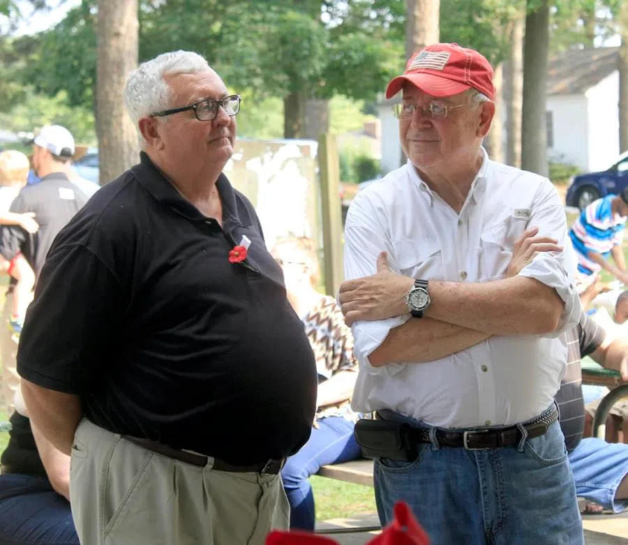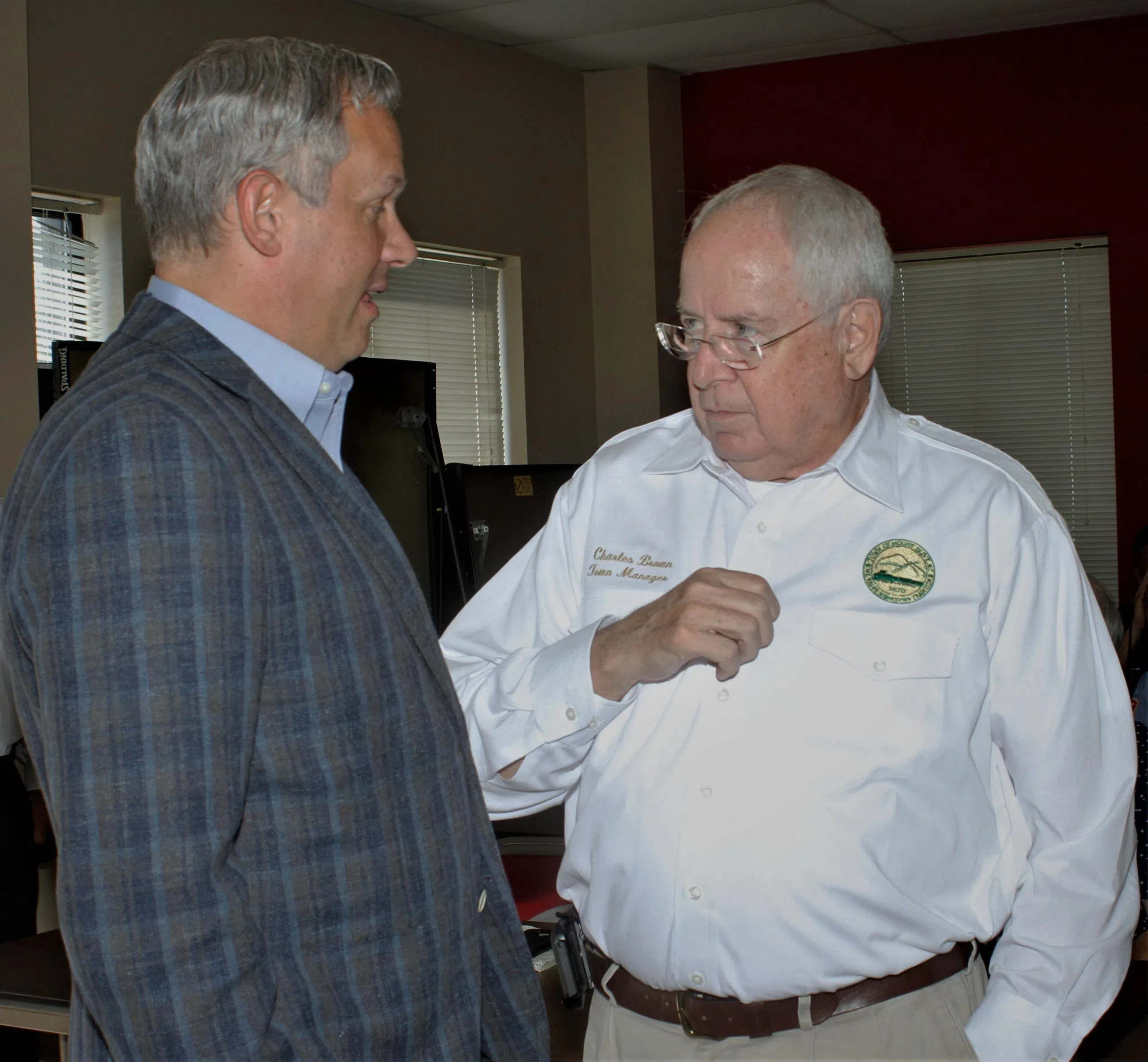 - Former Mount Olive Mayor Joe Scott talks with Town Manager Charles Brown