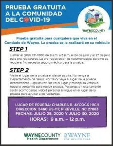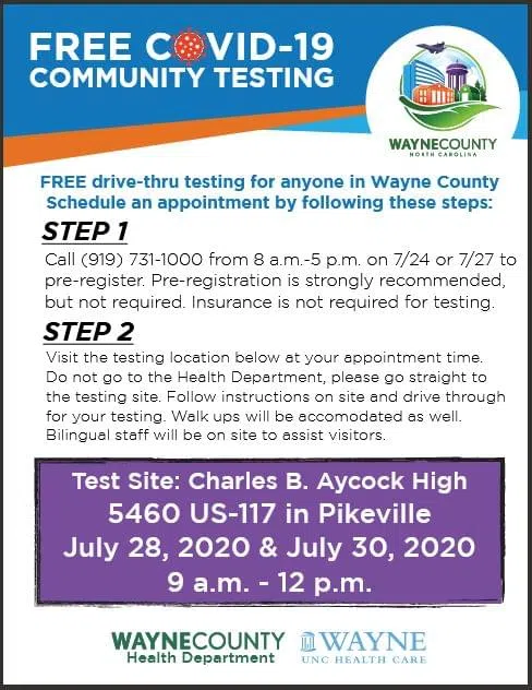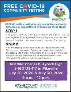 The Wayne County Health Department & Wayne UNC Health Care are offering free COVID-19 testing in Pikeville on July 28, 2020 and July 30, 2020 from 9 a.m. to 12 p.m. Testing will be offered at Charles B. Aycock High School at 5460 U.S.117 in Pikeville. Residents must visit Charles B. Aycock High School, not the Health Department, for testing.