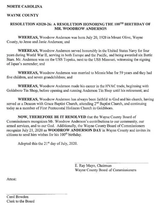This week, the Wayne County Board of Commissioners passed a resolution honoring the 100th birthday of Woodrow Anderson.
