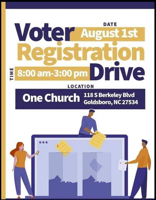 Make sure your voice is heard this November. One Church, at 118 S. Berkeley Boulevard in Goldsboro, is hosting a Voter Registration Drive this Saturday, August 1st. The Voter Registration Drive is being held from 8 AM – 3 PM.