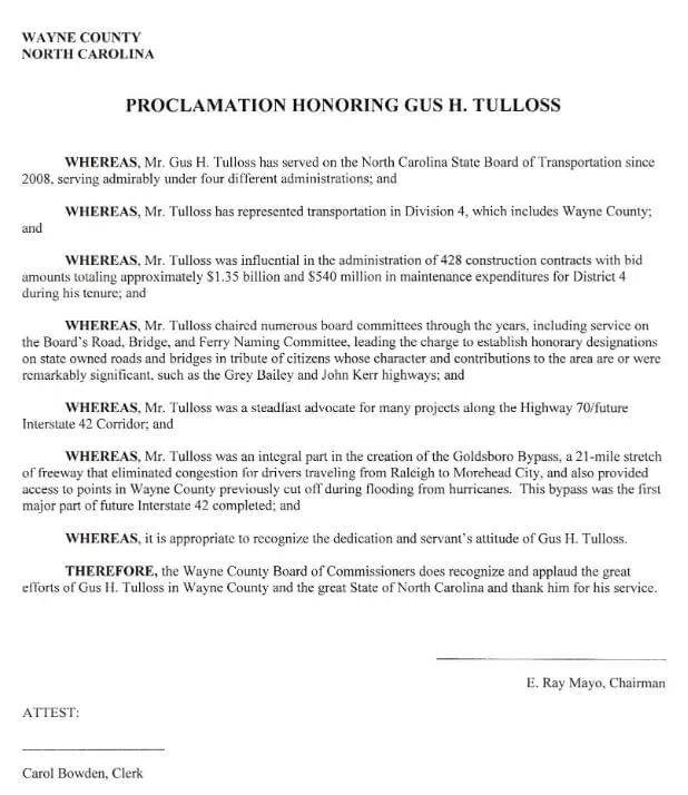 Tuesday, the Wayne County Board of Commissioners passed a proclamation honoring the many transportation contributions Tulloss made to the community.