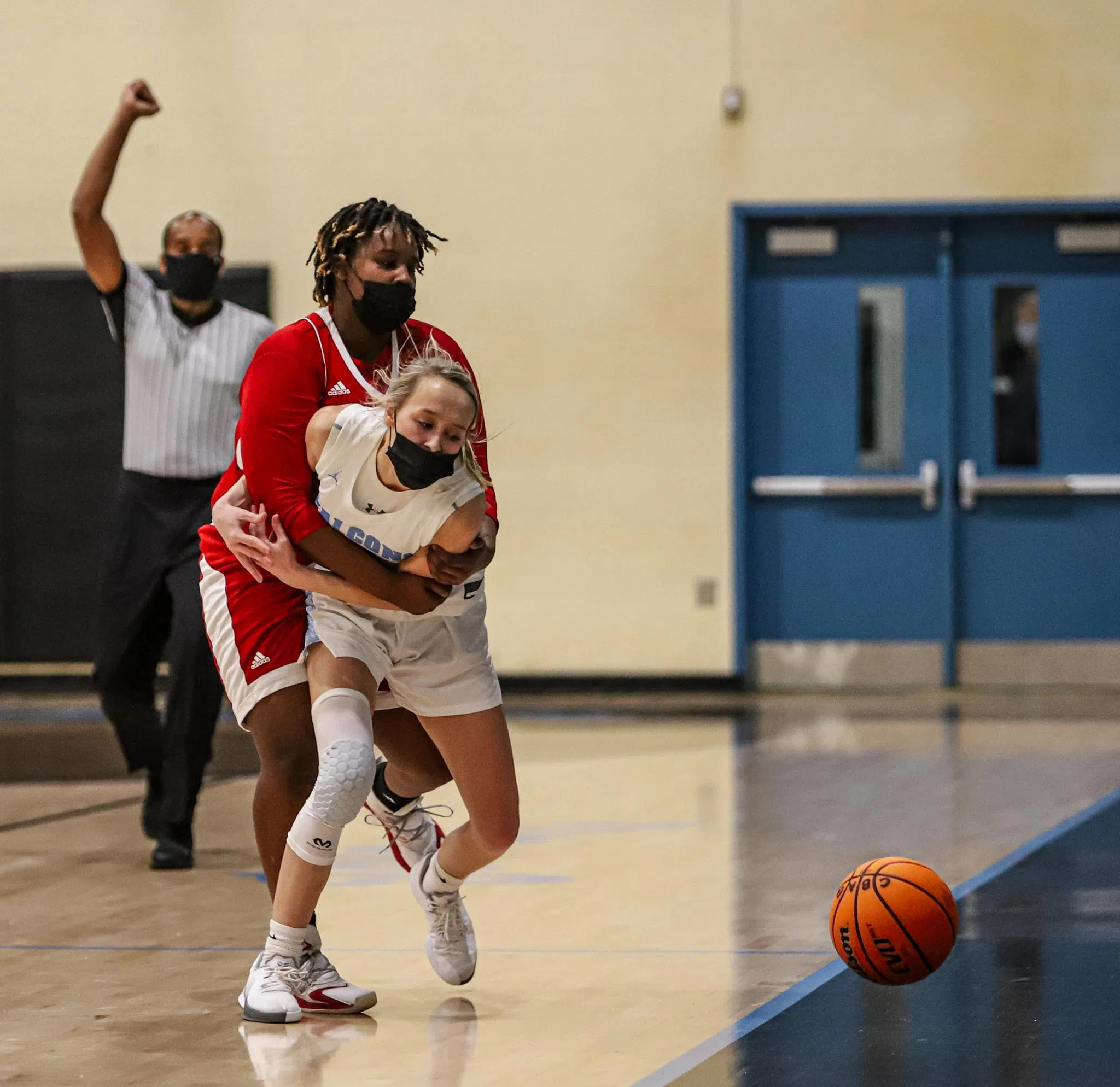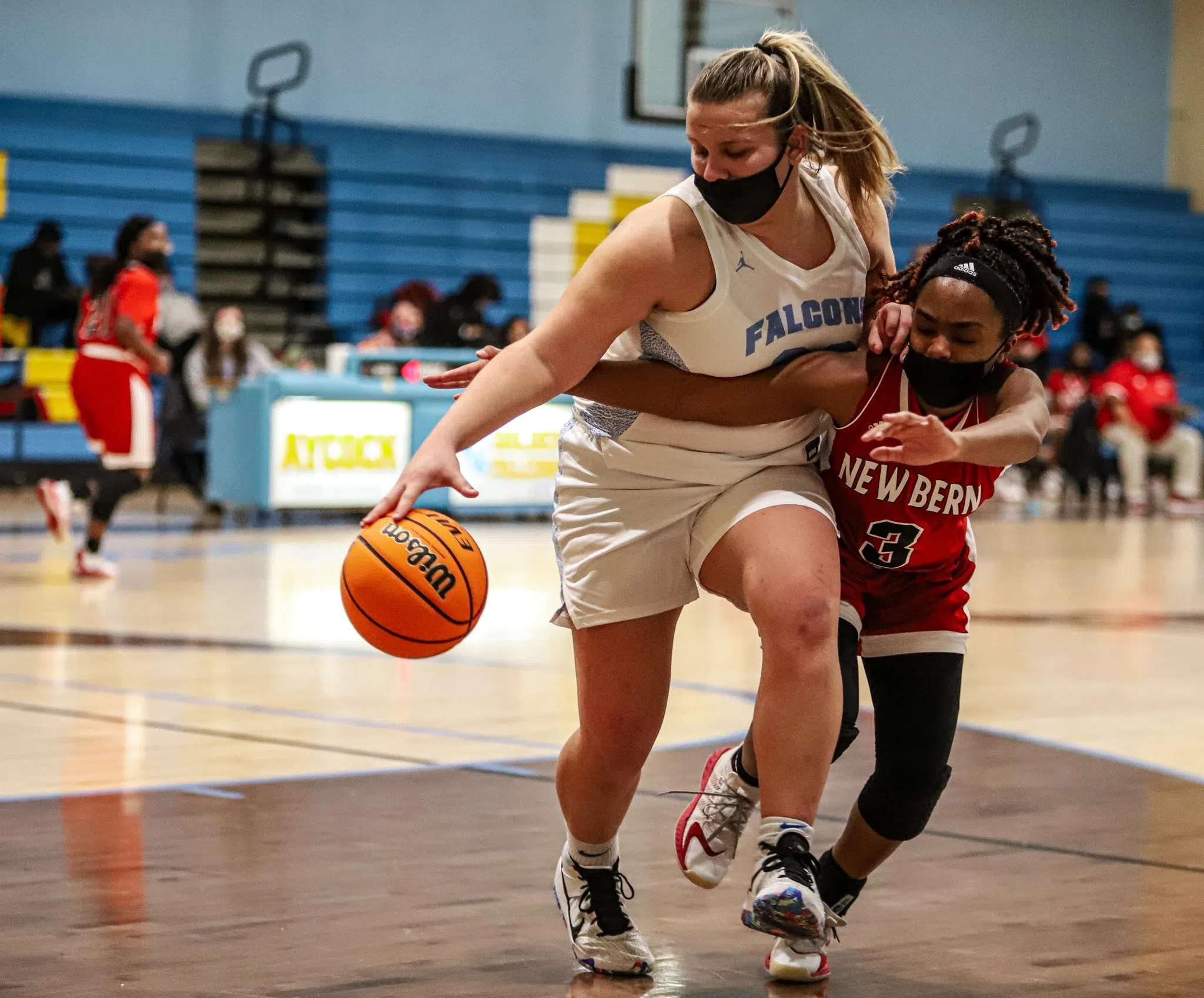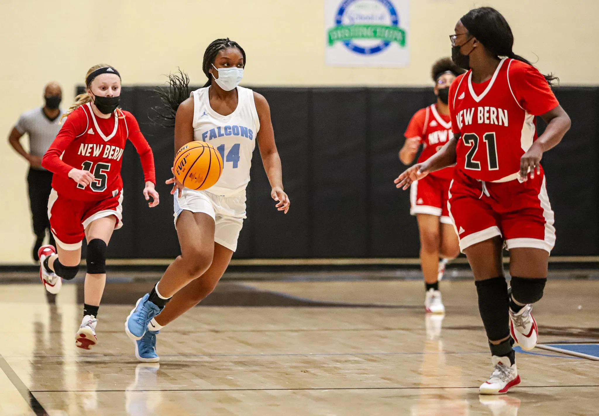 The Golden Falcons did a better job of handling New Bern’s press defense in the fourth quarter, and Smith’s three-pointer to play open the fourth quarter increased C.B. Aycock’s lead to 48-41, but the Bears kept battling back, and with just under two minutes left in the game, New Bern trimmed the deficit down to 60-54.