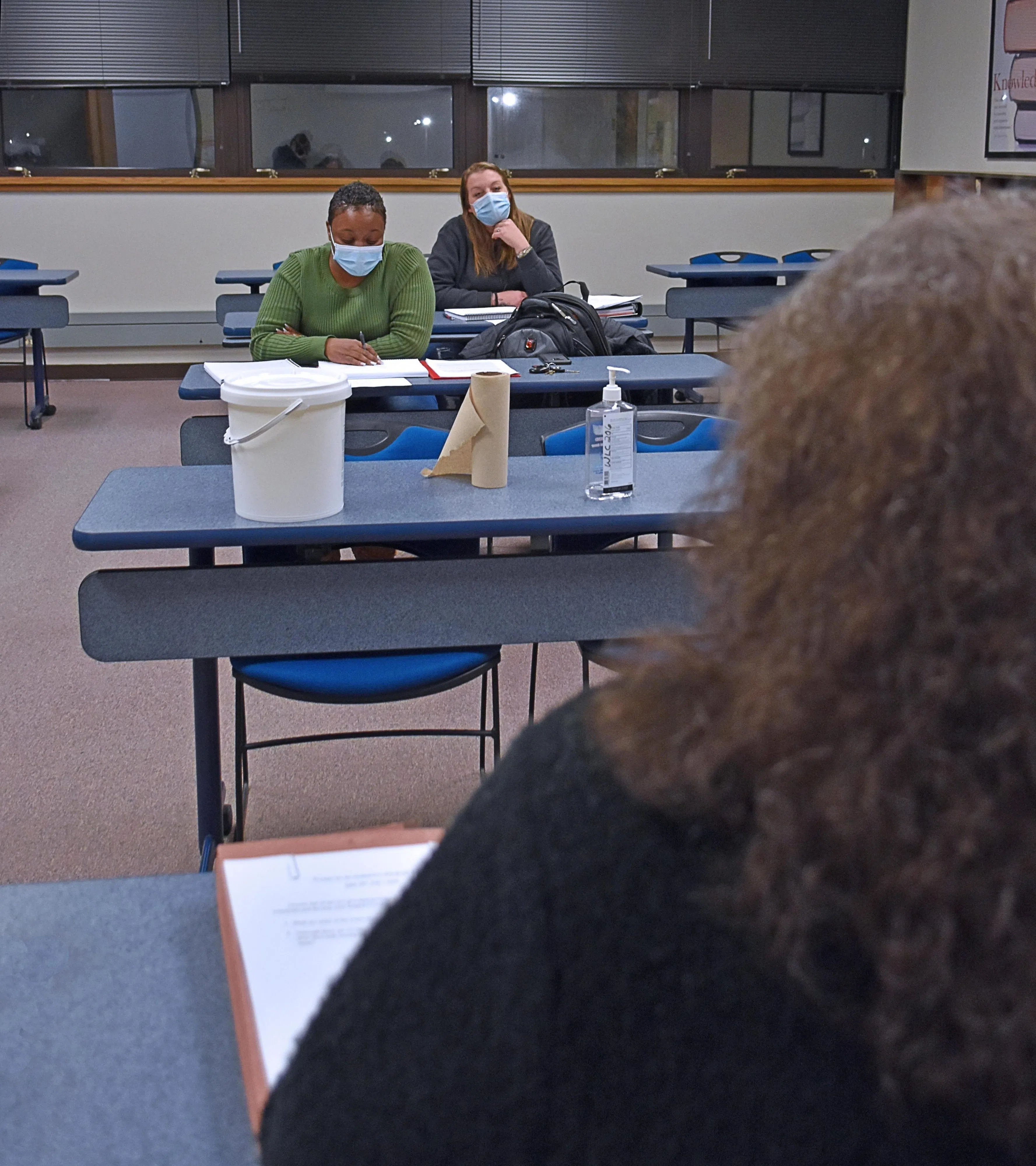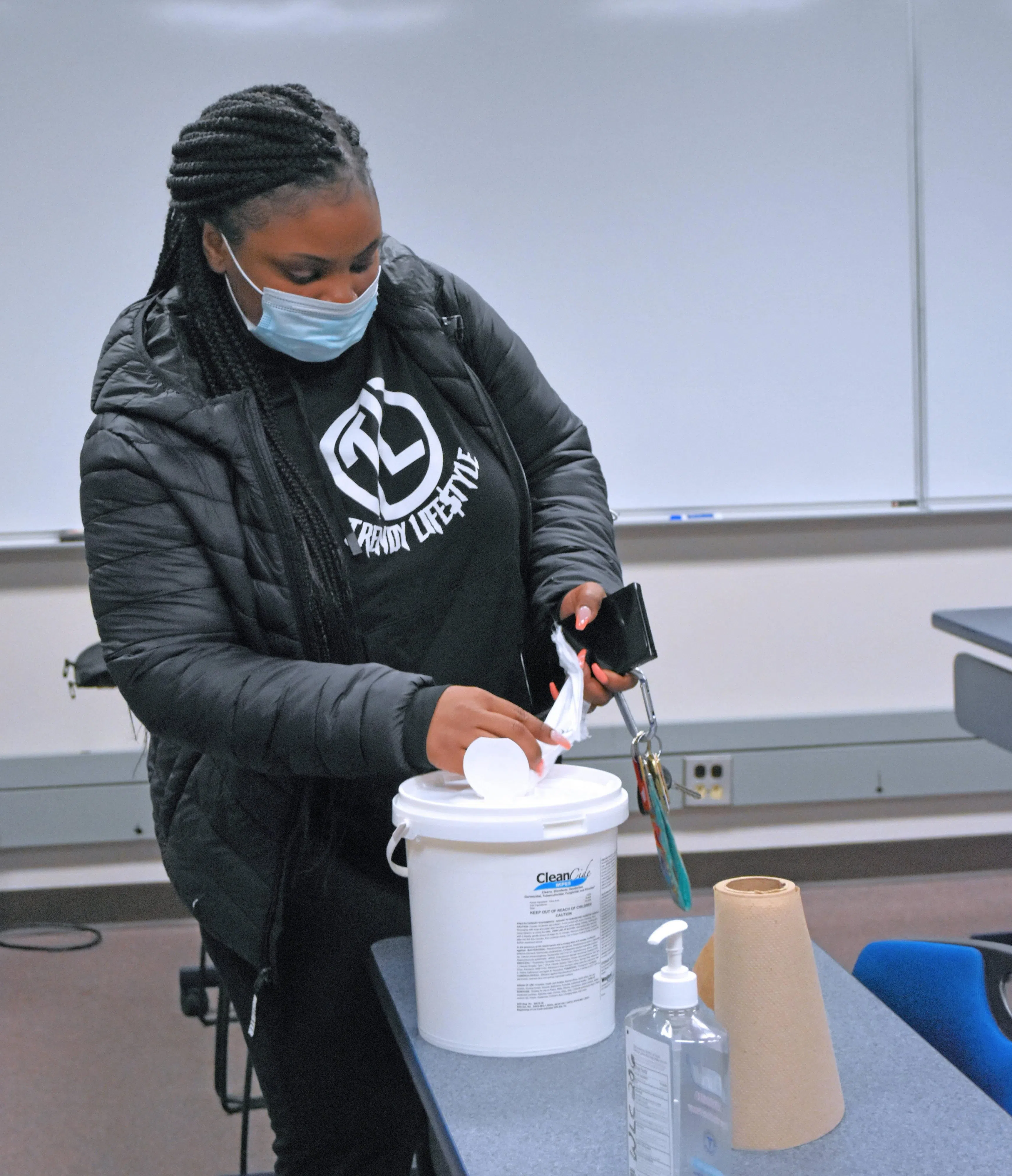 - Wayne Community College student Shaudrella Harvey grabs a sanitizing towelette so she can wipe off her desk before the in-person component of a hybrid course begins.