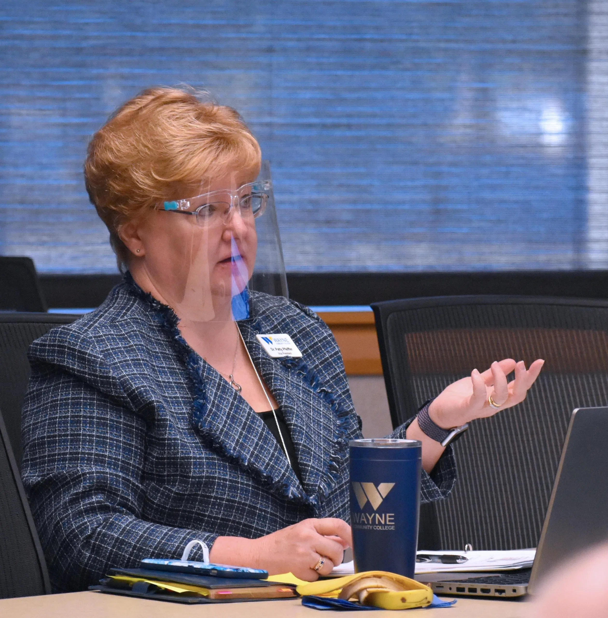 - Wayne Community College Vice President of Academic and Student Services Patty Pfeiffer, wearing a face shield that accommodates her eyeglasses, answers a question during a recent meeting.