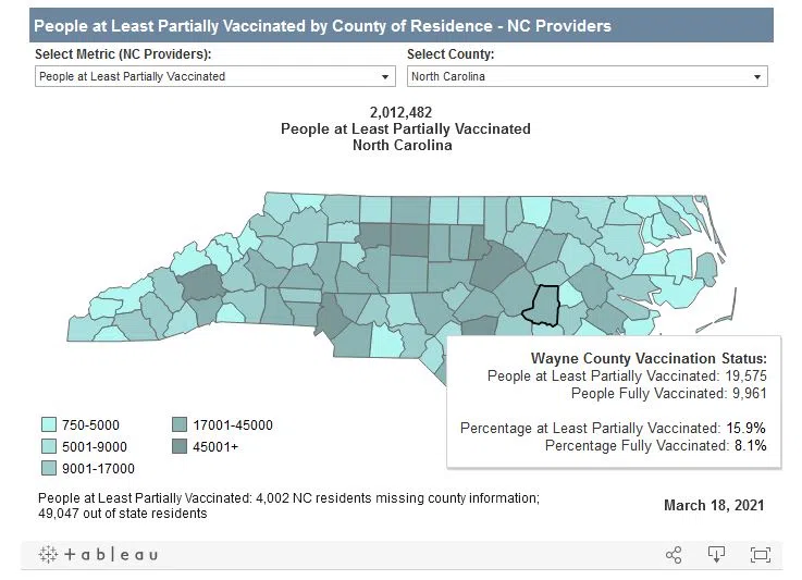 According to Thursday’s figures from the N.C. Department of Health and Human Services, 19,575 people were at least partially vaccinated in Wayne County and 9,961 people had been fully vaccinated.