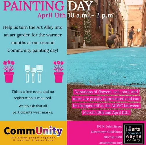 Help the Arts Council of Wayne County turn Art Alley into an Art Garden. The arts Council in Downtown Goldsboro is holding its second CommUnity Painting Day on Sunday from 10 AM – 2 PM. The event is free and no registration is required. Participants are asked to wear masks. Donations of garden supplies will also be greatly appreciated and can be dropped off at the Arts Council of Wayne County, 102 N. John Street, by Sunday.