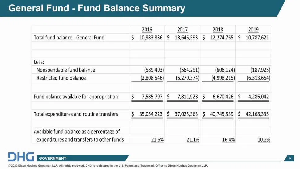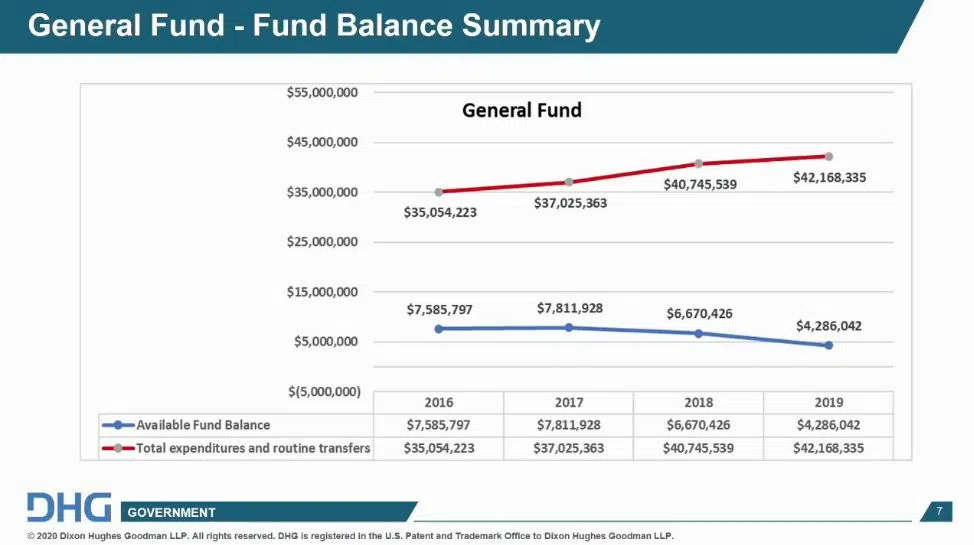 The Local Government Commission recommends maintaining at least 8% of a year’s worth of expenditures in available Fund Balance, and Goldsboro’s was at about 10%.