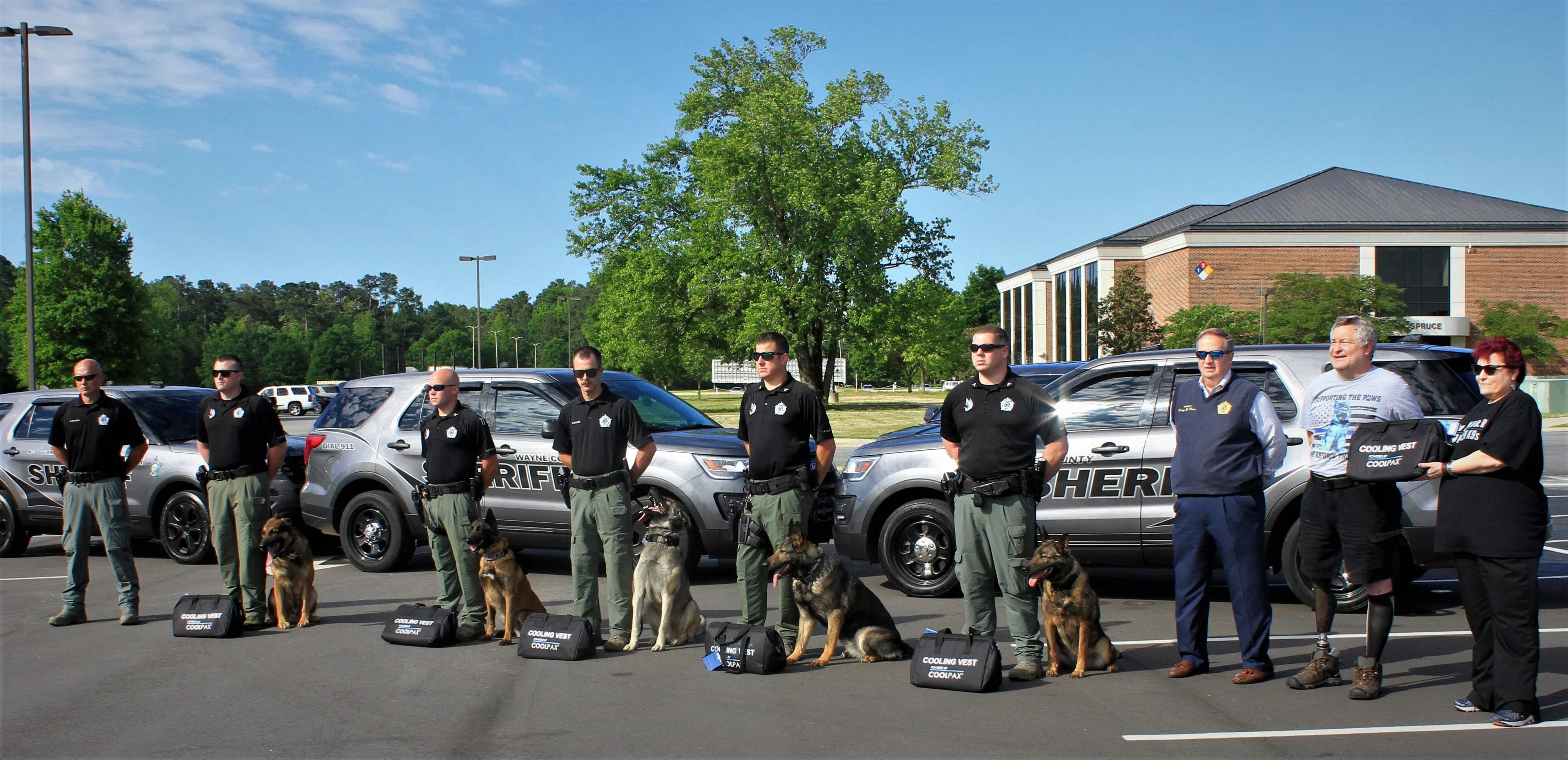 Members of the Wayne County Sheriff’s K-9 Units and Sheriff Larry Pierce met on the campus of Wayne Community College Monday morning to receive some new cooling vests that were donated to the K-...