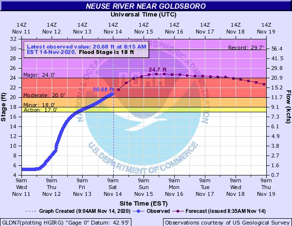 The Neuse River near Goldsboro has reached Moderate Flood Stage. According to the National Weather Service, the Neuse River was approaching 21-feet at 9 AM on Saturday. The current forecast has the ri...