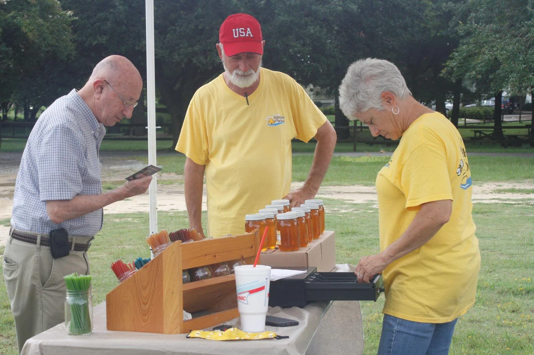 Members of Beekeepers of the Neuse were busy Saturday morning selling jars of locally grown honey at Waynesborough Park in Goldsboro. The event took place under a tent that was set up in the parking a...