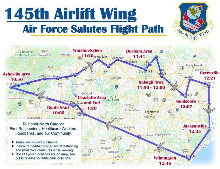 The 145th Airlift Wing, North Carolina Air National Guard will be conducting a one aircraft C-17 flyover of various North Carolina cities, hospitals, and food banks on Thursday, May 7, as part of Oper...