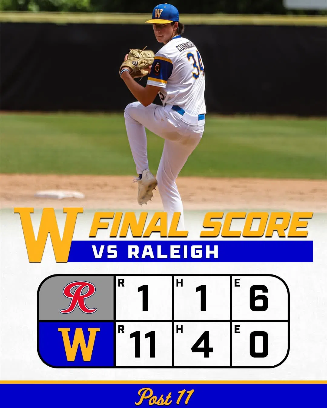 Carolina Athletic Park, Goldsboro —- It didn't take long for Wayne County Post 11(10-2) to get things started in the first versus Raleigh starter Jacob Lyjordan.Lawson Tyndall would reach on a s...