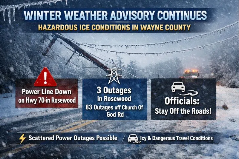 WAYNE COUNTY, N.C. - A Winter Weather Advisory remains in effect for Wayne County as freezing rain continues to create hazardous travel conditions across the region. Wayne County officials report a po...